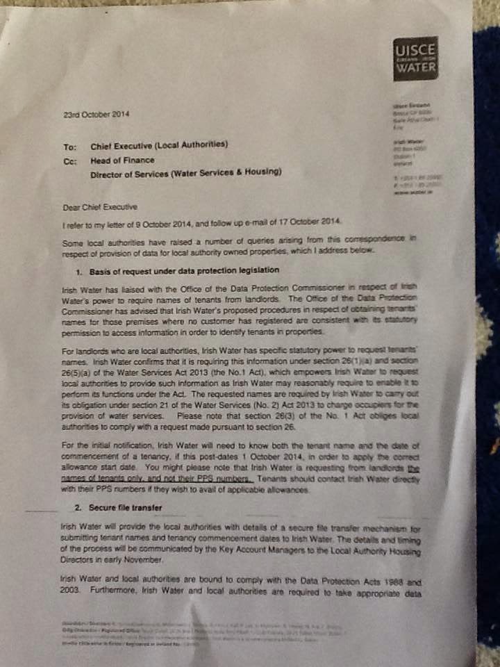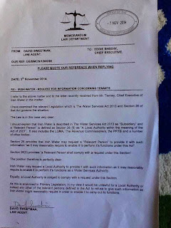 "The councils Law Agent issued his opinion which was presented to the council on Monday. He states that under Section 26 of The Water Services Act Irish Water may request a Local Authority to provide it with such information as it may reasonably require to enable it to perform it's functions as a Water Services Authority".